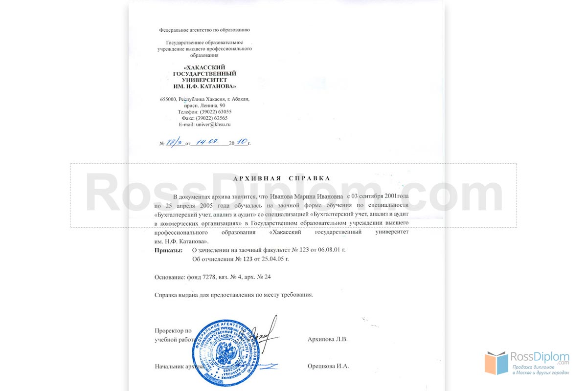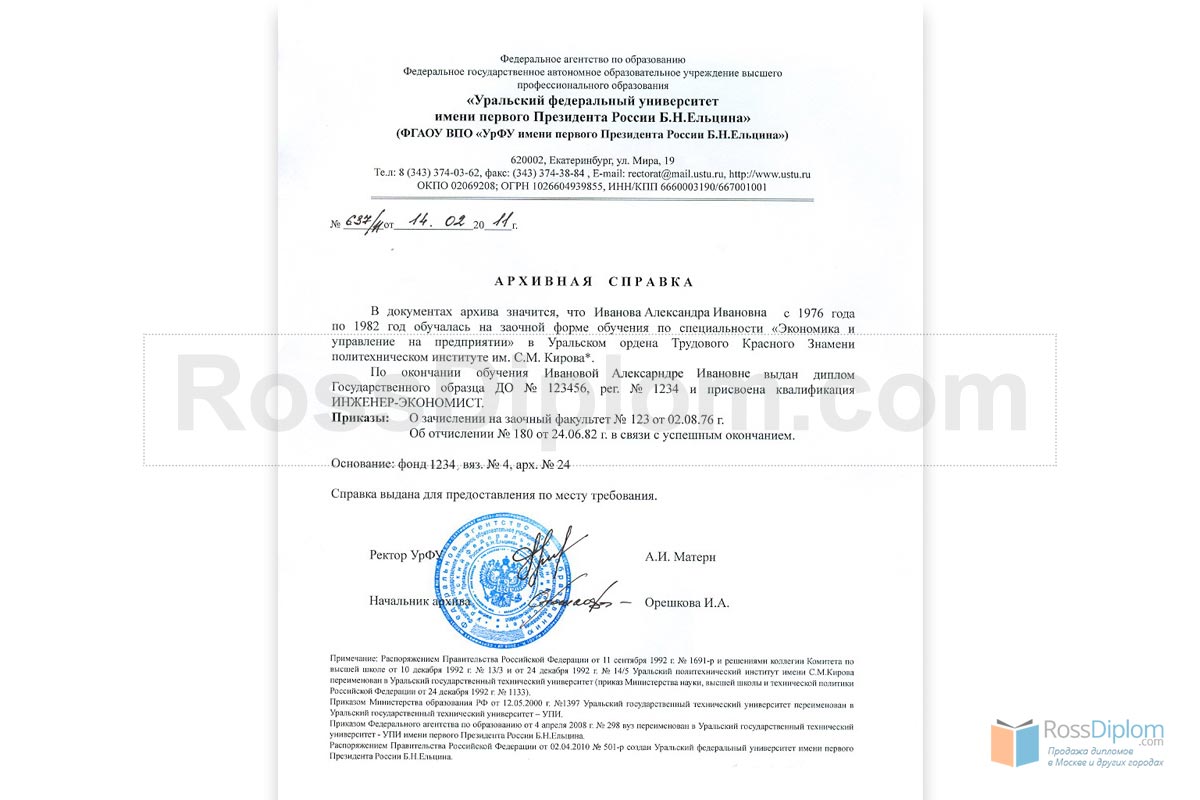 Архивная справка содержит информацию, подтверждающую хранящиеся в архивах организации сведения, а именно — факт Вашего обучения и наличие диплома о профессиональном образовании. Это та самая справка, которую требует (помимо самого диплома) работодатель, чтобы подтвердить факт Вашего обучения в ВУЗе, техникуме или колледже. Если Вы не можете получить официальную справку, решение о её покупке поможет решить и эту проблему.